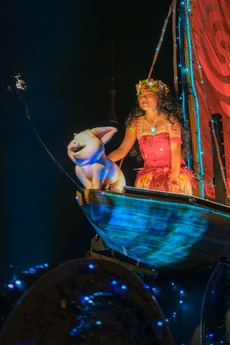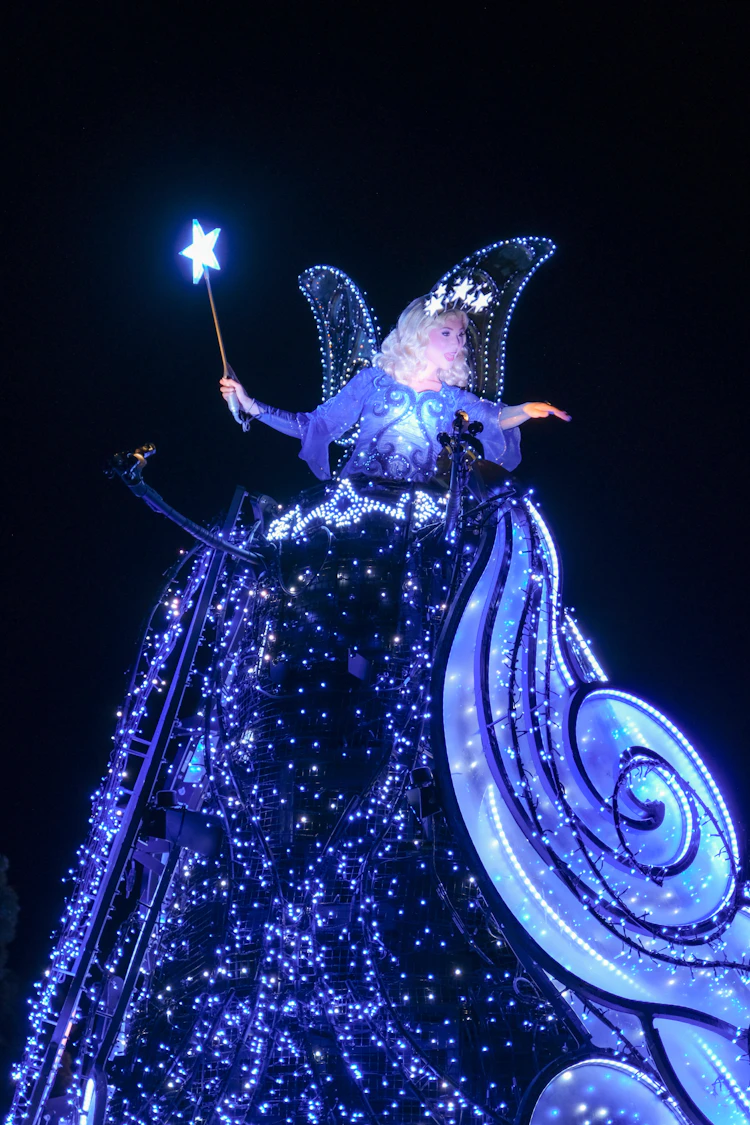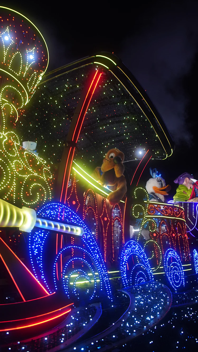 とにかくキラキラで光がまばゆい、まさに夢と魔法のパレード。「ディズニーのパレードといえばこういうスタイルだよね!」という、小さい頃のワクワク感を思い出すようなクラシックさと、キャラクターやストーリーに合わせた光の演出の新しさ。その両方を堪能できるひとときです。