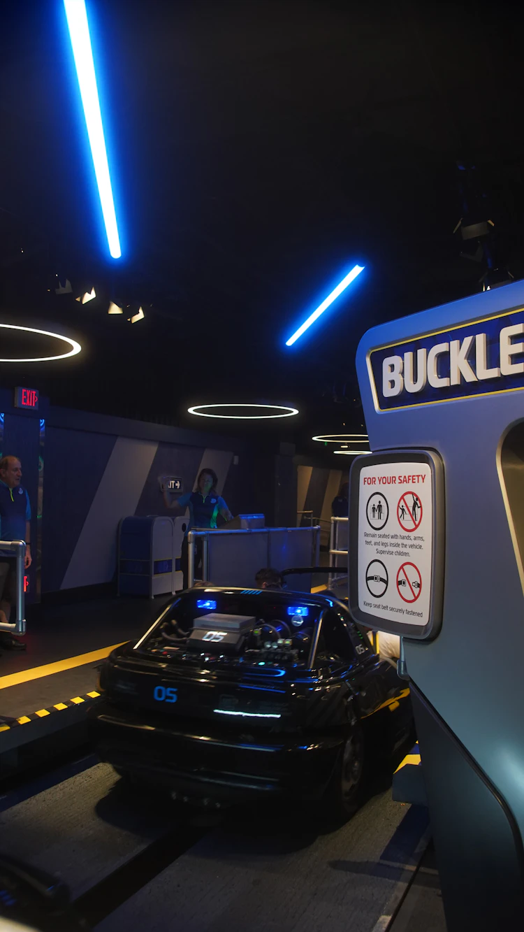 暗闇の中ネオンが光るキューラインを歩いていると、まるで映画の中に入っていくような感覚に。アトラクションはバイク型のライドで前屈みの体勢で乗るため、スリルも倍増です!